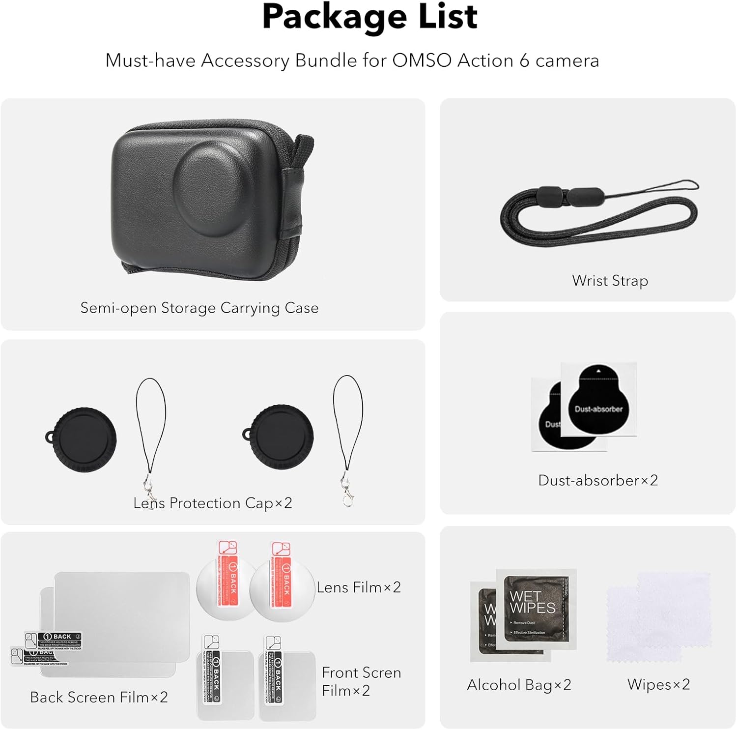 The media could not be loaded. I have an Osmo Action 6 camera and wanted to get a small case for storage of the camera only. I thought this looked like a good case kit because it also includes the glass protectors for the camera’s displays and caps for the lens. And, I like the idea of being able to use the case with the quick-connect attachment installed.I included a picture of everything that came with this case. The product description shows it should come with a carabiner (what they call a “buckle”), but that was missing from my kit. For me, that’s ok, as I have other carabiners I can use.The first thing to notice about this case is that it does not zip closed around all the sides. I am fine with it being open on the bottom for the quick-release access. But be aware that since this is not a fully closed case, you can’t store other loose items in it. I will use this case when traveling to places where I’ll be needing the quick-release functionality. Otherwise, for other situations and everyday storage, I’ll use a case that closes completelyThe case itself is nice enough. It seems thick enough and has a soft interior to protect the camera. I was able to easily fit my camera in the case with an additional CPL filter on the lens. I attached pictures of the case, including showing you what the open bottom looks like. You can see that I was able to leave a quick-connect attached to the camera, and it still fits in the case. I noticed that the opening is a bit wider when I add the quick-release attachment, though.Because of that bit of extra width, I worry that the zipper will easily open on this case. It doesn’t have a way to “lock” it in place, and the open bottom exerts some pressure on the zipper, causing it to slide open. You can see what I mean in those pictures - how the zipper won’t stay zipped closed for me.They include 2 glass protection films for each spot on the camera - the lens, the back display and the front display. There are also 2 wet/dry packs to use for installing those protectors. I’m not sure why they didn’t include 3 of the wet/dry packets since there are 3 different protectors to install.There were no instructions included on how to apply the protector films. Since I’ve installed similar things on other devices, I knew what to do. I included a video here showing that process as I cleaned my display and applied the protector. Unfortunately, the protector had hardly any stickiness, so it barely stuck to my display. I pushed it down on the display many times, but it still started coming off. You can see that issue in my video. Given the lack of stickiness with the protectors, I doubt they will stay on very long. And I really doubt you can use them underwater, or even if caught in the rain.One good thing is that the touch screen worked really well for me after I attached the protector to the back display. I included that in my video, too. After playing with my camera for a bit the protector seemed to be coming even more unstuck, so I finally took it off. It was barely stuck on. It definitely would have fallen off soon.The reason I liked the idea of this case was the fact that it had a wrist strap. This is a feature I really want for my Action 6 camera case. So, this case does have a wrist strap, and there is a loop on the case for it. But the loop is SO tiny and squished tightly shut! I haven’t been able to figure out how to get the thread of the wrist strap through the loop. I included a picture showing the loop with the wrist strap near it. I was able to just barely get a toothpick through the opening, and that took some effort. This is disappointing, as I really want a wrist strap with my case.A big positive of the kit is that it comes with two lens caps. They have a nice, snug fit on the lens. Note that if you use added filters (such as a CPL), the cap may not fit on those. Or, at least, the cap wouldn’t fit with my CPL filter attached. Interestingly, the lens caps have a small loop built in and come with small looping connectors that can attach somewhere - see my picture for reference. However, since the Action 6 camera itself doesn’t have a loop for attaching anything, I’m not sure where these lens caps are supposed to be attached. But at least the ability is there with these caps.Overall, while the case is nice if you want the ability to leave your quick-connect attached, there are other issues with the kit. These include the missing carabiner, the impossible-to-attach wrist strap, the non-sticky protectors and the looseness of the case’s zipper.I hope this information helps!cheers,c~