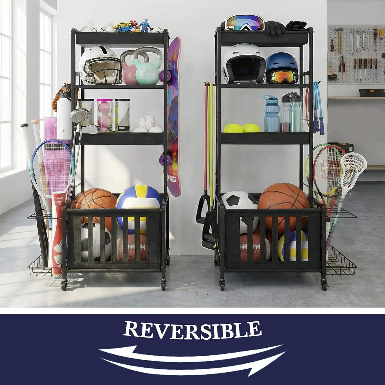 So happy to receive this unit!! I needed an even smaller footprint for my small space, and this organizer is perfect! I love the multiple shelves on top, the side bars, and the big open box on bottom. I can't wait to assemble, but looks pretty easy and straight forward. Also, it has WHEELS!!! I love the opportunity for immediately mobility. I can just roll it over the middle or other side of the room, or move it to wherever!! There's also various uses for this organizer like a crafts room, but it's billed for sports equipment storage/organizer. Quality & made of solid metal, this organizer is durable to last a long time, and functional to organize more more that sports equipment. I definitely recommend this rack to you even though the price here seems a little high, but it absolutely gets 5 stars from me!