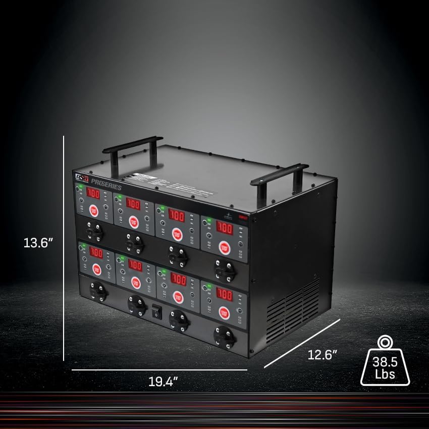 Great for fleet or shop use, the Schumacher DSR127 is a professional-grade car battery charging station built for high-demand environments like automotive shops, marinas, and fleet maintenance facilities. This powerful unit features eight independent charging banks, each capable of delivering 2 amps to 12 amps for charging and maintaining 6V or 12V batteries, including standard, AGM, gel, deep-cycle, and lithium (LiFePO4) types. Whether you’re working on a car, motorcycle, ATV, truck, SUV, marine battery, or lawn equipment, the DSR127 car battery charging station offers unmatched flexibility and performance. Each bank operates independently with fully automatic multi-stage charging, including smart trickle charge and battery reconditioning (not for lithium batteries), helping extend battery life and optimize performance. Key Features: Variable Power: Each bank delivers 2A to 12A for fast, efficient charging and battery maintenance. Eight Charging Banks: Ideal for busy garages and fleet operations. Digital Displays: Each bank features a dedicated screen showing real-time volt, amperage, and battery percentage. Built-in Battery Tester: Offers quick diagnostics of connected batteries. Battery Tender Mode: Smart trickle charging maintains battery health without overcharging. Safety First: Includes reverse polarity protection, spark-proof clamps, safe-start, short circuit, overcharge, and thermal runaway protection. Fan-Cooled Performance: Built-in fans activate as needed to maintain peak operation. High-Quality Construction: Durable steel case and eight sets of detachable booster cables. 15-Foot Total Reach: Includes a 9-foot power cord and eight 6-foot booster cables with 75A color-coded clamps. Whether you’re maintaining seasonal vehicles or managing a full fleet, the Schumacher DSR127 delivers max performance, safety, and convenience. It’s the ultimate automotive intelligent battery charging station for professionals who need reliable, high-capacity charging across multiple battery types. En español (ES): Experimente la calidad excepcional y las innovadoras características en las que confían los mecánicos profesionales con Schumacher Electric. Presentamos la estación de carga de baterías totalmente automática Schumacher DSR ProSeries DSR127 de 6 voltios/ 12 voltios y ocho bancos, diseñada para satisfacer las exigentes necesidades de los talleres profesionales más concurridos. Esta estación de carga permite cargar hasta ocho baterías de 6 y 12 voltios simultáneamente, lo que maximiza la eficiencia en su espacio de trabajo. Cada uno de los ocho bancos es totalmente automático y está controlado por un microprocesador, que ajusta perfectamente la salida de 2 A a 12 A en función de las necesidades de cada banco. Con el bus de comunicación conectando los bancos, el DSR127 monitorea el voltaje, la temperatura y la corriente para optimizar los tiempos de carga y evitar la sobrecarga de los dispositivos. Para potencia de carga adicional, también puede cargar desde dos bancos y duplicar la salida a impresionantes 4A y hasta 24A. La seguridad es primordial, por lo que el modelo DSR127 está equipado con protección contra sobrecarga, polaridad inversa, embalamiento térmico y cortocircuito. Diseñada con un potente rendimiento, una construcción resistente y una durabilidad inigualable, el modelo DSR127 es la elección definitiva para talleres y concesionarios profesionales. Actualice sus capacidades de carga con la unidad DSR ProSeries DSR127 de Schumacher y experimente un rendimiento y confiabilidad de primer nivel.