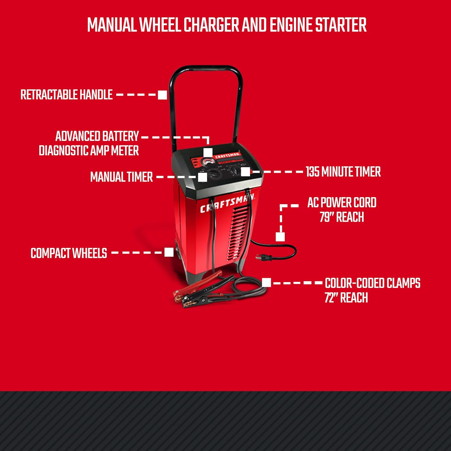 When it comes to reviving dead batteries, the CRAFTSMAN CMXCESM274 delivers the kind of performance and control that seasoned mechanics and DIYers trust. Built like the old-school chargers but with modern reliability, this manual battery charger is perfect for garage or farm use. This 2-in-1 automotive battery charger and engine starter is designed for those who want hands-on control. With a 175-amp engine start and a 25-amp boost mode, it charges fast and starts strong—even when dealing with deeply discharged 12V batteries. The 6-amp charge mode is ideal for steady, routine charging. The CMXCESM274 features a 135-minute timer that gives you full control over the charging cycle. Simply set the timer based on your battery’s condition, monitor charging, and the unit will automatically shut off when the time expires—helping prevent overcharging while giving you precision control. With wide compatibility, this 12V battery charger supports standard, AGM, gel, and deep-cycle batteries across a range of vehicles—from motorcycles and ATVs to trucks, SUVs, RVs, and marine equipment. The analog ammeter provides a simple, no-digital-nonsense way to monitor charging progress. CRAFTSMAN’s reputation for quality is built into every detail—from the rugged steel housing and heavy-duty clamps to the solid wheels and retractable handle that make it easy to move around your workspace. This is a mid-duty unit built for reliability and durability. Key Features: Manual Operation: Timer-controlled charging gives you full control—ideal for reviving dead and deeply discharged batteries Engine Starter Power: 175A engine start and 25A boost mode for fast, strong starts Simple Monitoring: Analog ammeter for easy, real-time charge tracking Wide Compatibility: Works with 12V standard, AGM, gel, and deep-cycle batteries Heavy-Duty Build: Steel case, rugged wheels, and durable clamps for long-lasting performance Whether you're maintaining your own fleet or just need a reliable car battery charger for your garage, the CMXCESM274 is the dependable, heavy-duty solution that puts you in control. En español (ES): Cuando se trata de revivir baterías agotadas, CMXCESM274 de CRAFTSMAN ofrece el rendimiento y control en el que confían los mecánicos experimentados y los aficionados. Fabricado como las unidades de la vieja escuela, pero con la confiabilidad moderna, este cargador de baterías manual es perfecto para uso en el garaje o en la granja. br> Este cargador de batería de automóvil y arrancador de motores 2 en 1 está diseñado para quienes desean un control práctico. Con arranque de motores de 175 amperios y un modo de refuerzo de 25 amperios, carga rápidamente y arranca vigorosamente, incluso cuando se conecta a baterías de 12V muy descargadas. El modo de carga de 6 amperios es ideal para una carga estable de rutina. CMXCESM274 cuenta con un temporizador de 135 minutos que ofrece un control total sobre el ciclo de carga. Solo tiene que programar el temporizador según el estado de la batería, monitorear la carga y la unidad se apagará automáticamente cuando expire el tiempo, lo que le ayudará a evitar sobrecargas y le proporcionará un control preciso. Gracias a su amplia compatibilidad, este cargador de baterías de 12V admite baterías estándares, AGM, de gel y de ciclo profundo de una amplia gama de vehículos, desde motocicletas y todoterrenos hasta camiones, utilitarios deportivos, casas rodantes y equipos marinos. El amperímetro analógico ofrece una forma sencilla y no digital de monitorear el avance de la carga. La reputación de calidad de CRAFTSMAN está integrada en cada detalle, desde la robusta carcasa de acero y las pinzas de alta resistencia hasta las sólidas ruedas y la manija retráctil, que facilitan el desplazamiento por su espacio de trabajo. Es una unidad para trabajos intermedios fabricada para ofrecer confiabilidad y durabilidad. Características principales Funcionamiento manual: la carga controlada por temporizador ofrece control total, característica ideal para revivir baterías agotadas y muy descargadas Potencia de arranque de motor: arranque de motores de 175A y modo de refuerzo de 25A para arranques rápidos y vigorosos Monitoreo simple: Amperímetro analógico para seguimiento sencillo de la carga en tiempo real Amplia compatibilidad: funciona con baterías estándares, AGM, de gel y de ciclo profundo de 12 V Fabricación para trabajo pesado: Carcasa de acero, ruedas robustas y pinzas durables para un rendimiento de largo plazo Esté manteniendo su propia flota o necesite un cargador de baterías de automóvil confiable para su garaje, CMXCESM274 es una excelente solución para trabajo pesado que le da el control. En français (FR) : Un garage bien équipé doit comprendre un chargeur de roues puissant et fiable avec une grande puissance de démarrage. Si vous êtes à la recherche d’un chargeur de batterie et d’un démarreur d’appoint robustes qui vous laissent le contrôle, ne cherchez pas plus loin : le CRAFTSMAN® CMXCESM274 175 Cranking Amp 12-Volt Manual Wheeled Charger and Jump Starter (chargeur de roues et démarreur d’appoint manuel) est fait pour vous. Les chargeurs automatiques peuvent être faciles à utiliser, mais certains mécaniciens veulent contrôler et surveiller manuellement le processus de charge. Avec le CRAFTSMAN® CMXCESM274, c’est vous qui dirigez complètement la recharge. L’appareil vous permet de régler la minuterie de 135 minutes et l’ampérage, puis de surveiller la recharge au moyen de l’ampèremètre intégré. Avec le CRAFTSMAN® CMXCESM274, vous disposerez d’une puissance suffisante pour répondre à vos besoins en matière de recharge. Le démarrage du moteur en 175 ampères est suffisamment puissant pour démarrer les SUV, les camions et d’autres gros moteurs. Le mode de survoltage de 25 ampères ravivera rapidement même les batteries profondément déchargées. Pour les besoins de recharge de base, le
