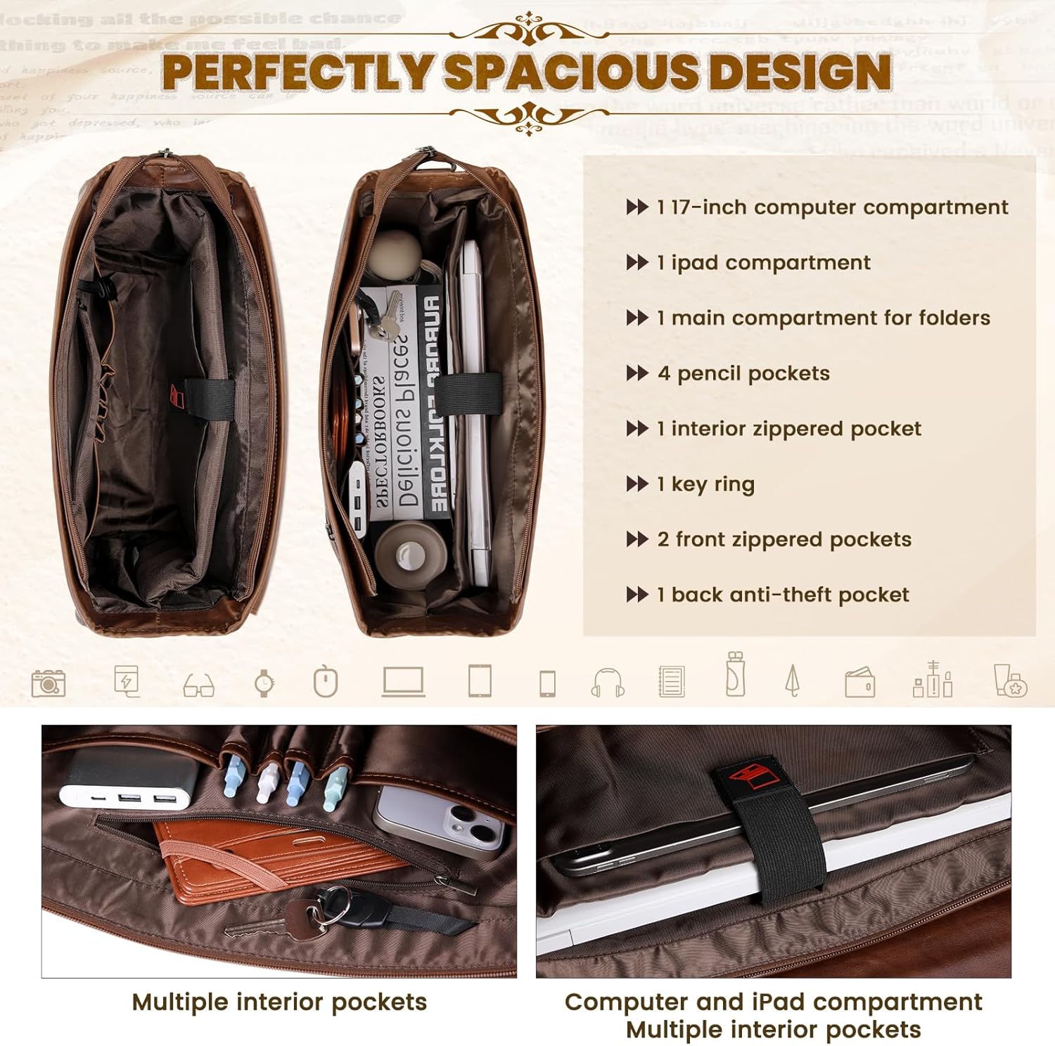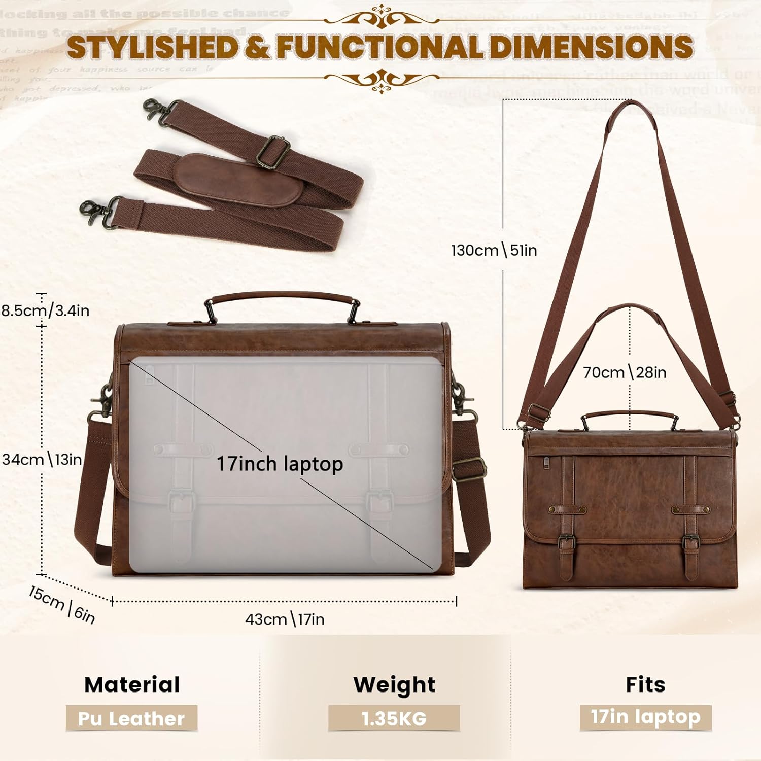 I purchased this bag for my husband, and it has exceeded our expectations! The quality is impressive sturdy, well-made, and stylish without being too flashy. The 17-inch size is perfect for his laptop, work folders, and all his daily essentials. He especially loves the organized compartments, which keep everything neat and easy to find.The strap is comfortable and adjustable, making it great for carrying all day, and the material feels durable and long-lasting. It has a professional look that works perfectly for the office, meetings, and everyday use.Overall, this bag is an excellent value for the price. My husband is very happy with it, and I highly recommend it to anyone looking for a reliable and stylish work bag!