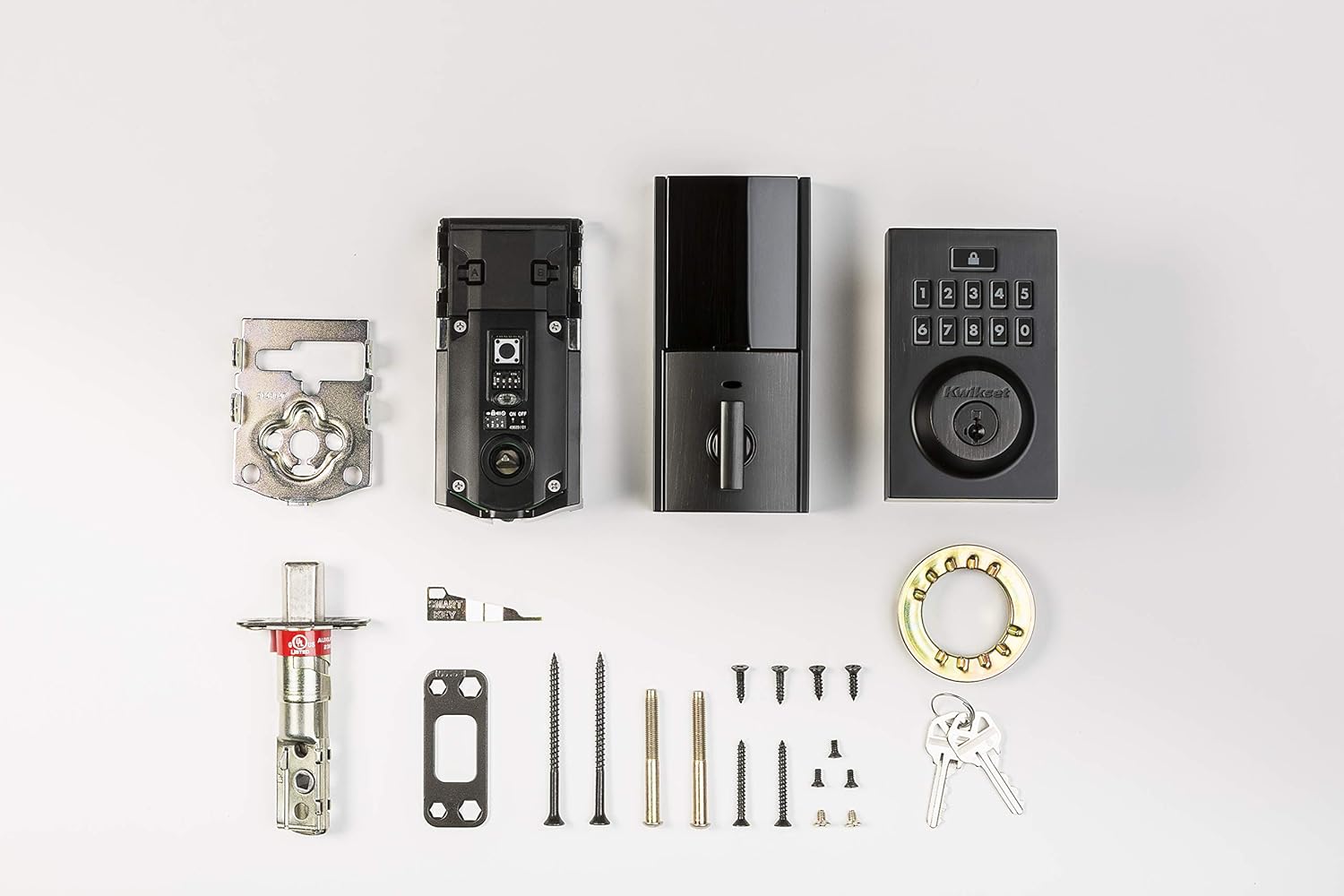 Interior Assembly, Exterior Assembly, Latch, Strike, Keys, Adapter Ring, Mounting Plate, SmartKey Tool, Installation Hardware, 4 AA Batteries, Installation Guide